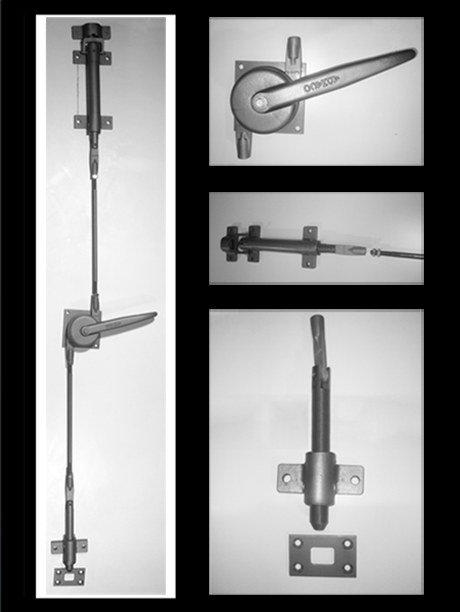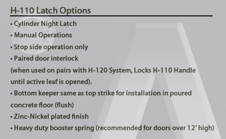 Recommended for standard height and extremely tall doors requiring automatic, positive high strength bolting action with latching pressure at the head and sill…(can be installed on either hinge side or stop side)…can also be used on the inactive leaf of double doors with the Adhaco H-120 System installed on active lead of double-door. Standard fasteners included are hex head cap screws. Features include positive retraction and retention of latch bolts when the door is open; prevents dragging and floor damage automatic latching when the door is closed. Adjustable linkage rods, attractive cast handle with safety torque return spring. Corrosion resistant, high strength malleable iron castings rugged 1¼" cold rolled steel bolts, standard finish U.S. Prime, other finishes available. Standard weight: 60 lbs. minimum.