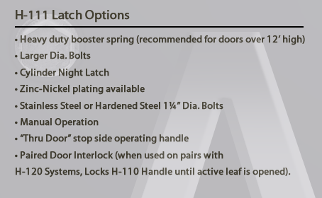Latch hardware will be Adhaco H-111 Two Point Vertical Slam Latch, positive acting, adjustable, vibration-proof and pressure exerting. Latching will be two 1¼" diameter cold rolled steel bolts interconnected by adjustable control rods to be cast malleable operating handy. Movement of operating handle simultaneously retracts latch bolts. Bolts shall be retained in the retracted position until the door is slammed closed allowing the latch bolts to automatically engage the strikes. Spring-back of the operating handle shall be prevented by a concealed safety torque return spring. Structural analysis shall be provided by manufacturer indicating strengths of hardware tarnished.