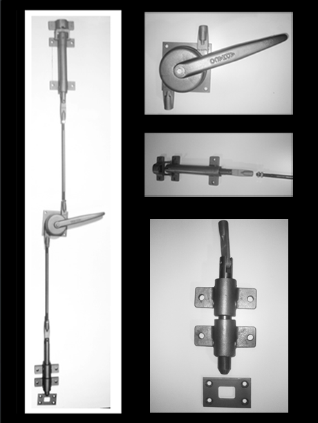 Recommended for standard height and extremely tall doors requiring automatic, positive high strength bolting action with latching pressure at the head and sill…(can be installed on either hinge side or stop side)…can also be used on the inactive leaf of double doors with the Adhaco H-120 System installed on active lead of double-door. Standard fasteners included are hex head cap screws. Has a Special longer bottom bolt, socket head (high strength) fasteners, extra bottom bolt guide. Features include positive retraction and retention of latch bolts when the door is open; prevents dragging and floor damage automatic latching when the door is closed. Adjustable linkage rods, attractive cast handle with safety torque return spring. Corrosion resistant, high strength malleable iron castings rugged 1¼" cold rolled steel bolts, standard finish U.S. Prime, other finishes available. Standard weight: 60 lbs. minimum