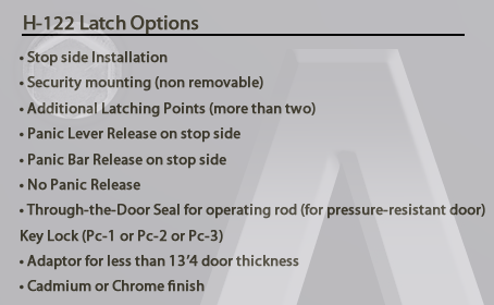 H-122 Multi-Point Latch the perfect solution for the large and tall Industrial doors. For the average size door, two latches normal provide the necessary sealing power. When the door closes, its inertia activates the H-122’s “slam action” to secure and seal the door panel against compression stops. This latching system is unequalled for weather-tight, sound–proof, or pressure resistant doors.