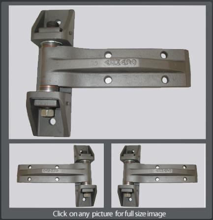 Extra heavy and extra high capacity of H-418 hinge exceeds capabilities of H-412 hinge (see sheet H-3). Patented adjustable features allow door to be adjusted in reestablish perfect alignment and plumb swing. The gusset in cast ductile iron strap, socket head (120,000 psi) pintle bolt and socket head fasteners.
